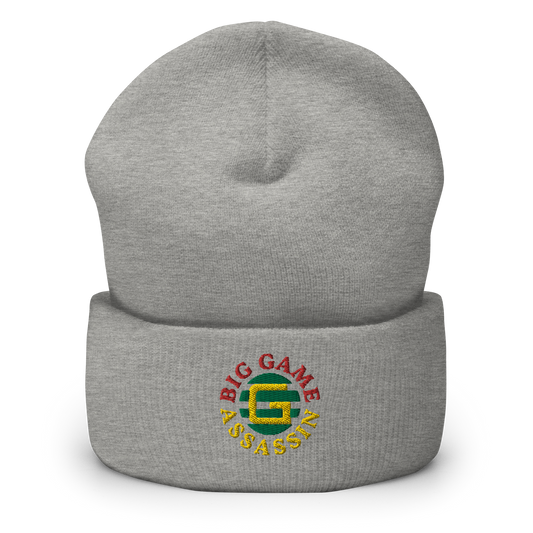 BIG GAME ASSASSIN® AW4 Cuffed Beanie (circular design). Red, green and yellow design. One size.