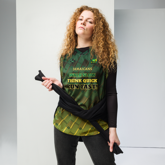 JAMURBAN® "JAMAICANS ... RUN FAST!" Unisex basketball jersey. Green+Black+Yellow gradient. Sizes 2XS - 6XL.